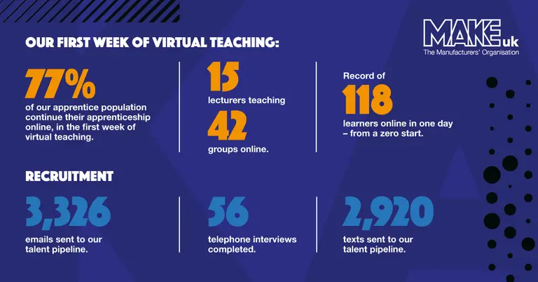 Over three quarters of its apprentice population of 1762, who are usually based at the Make UK Technology Hub in Aston, Birmingham, were able to continue their studies online in the first week of virtual teaching and assessments, with a record 118 online learners recorded in one day, being taught their academic studies.