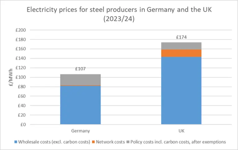 Using predicted future wholesale electricity prices for financial year 2023/24, applying carbon costs, renewable levies, network charges, and government exemptions for the UK and Germany, the electricity prices that a steel company would pay are currently estimated to be £174/MWh for UK steel producers and £107/MWh for German producers: